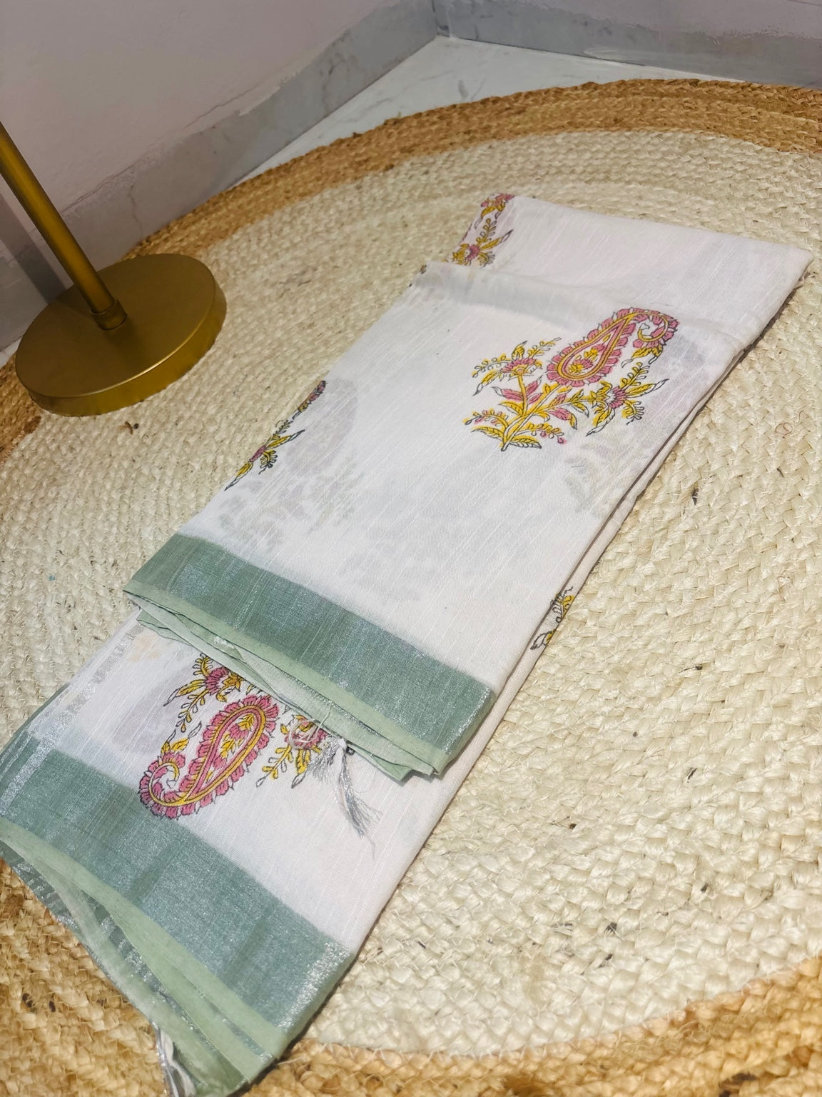 A serene white linen canvas adorned with delicate paisley motifs in soft pink and mustard, framed with a subtle green silver-zari border. Light and graceful, with a tasseled pallu to complete the look — perfect for everyday elegance and festive rituals alike.