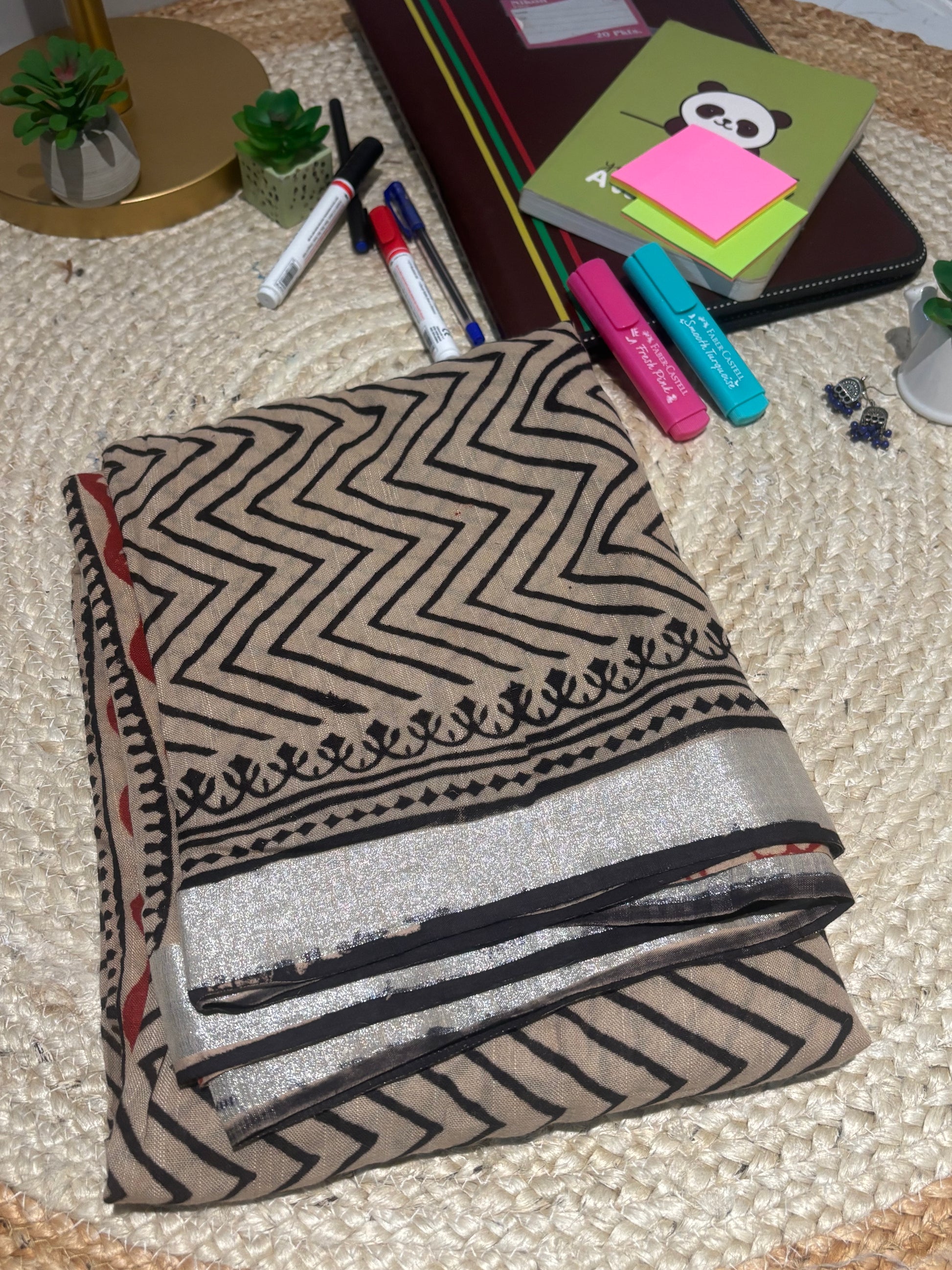 Earthy hues meet geometric rhythm in this natural-toned Dabu saree. The hand-drawn zigzag pattern paired with a minimal border gives it a rustic yet modern charm. Crafted in pure cotton for comfort that feels like home — ideal for slow mornings, art fairs, and everyday ease.
