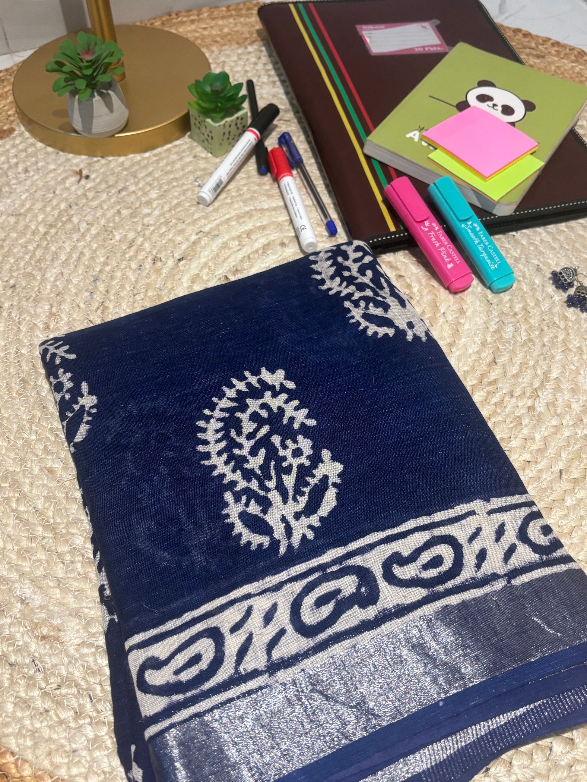 A deep indigo canvas brought to life with traditional handblock motifs in white. Its bold contrast border and handcrafted patterns celebrate the timeless art of Indian craftsmanship. Soft, breathable, and effortlessly graceful — perfect for soulful days and serene evenings.